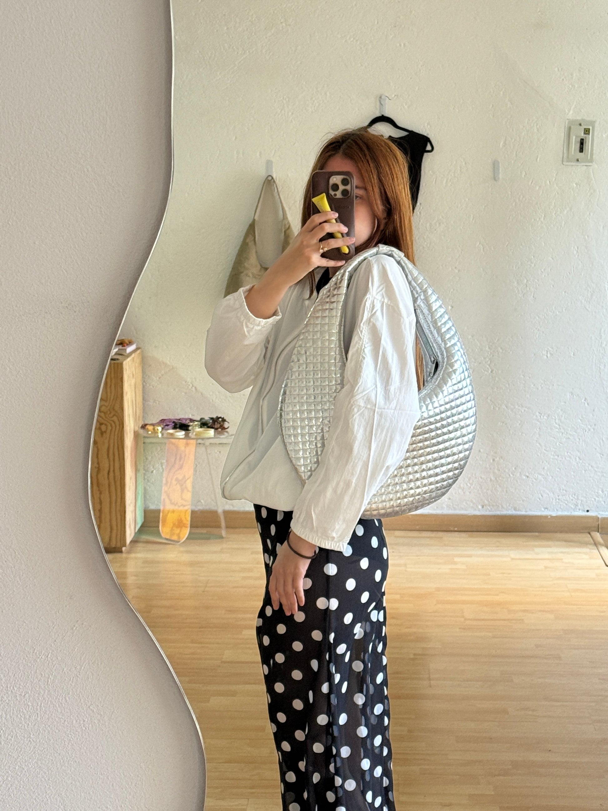 tiene unas tiritas para ajustarla como bomber o como chamarra normal :) la de la foto es m, te recomendamos subir una talla de lo que normalmente usarías para un fit mas relajado oversized