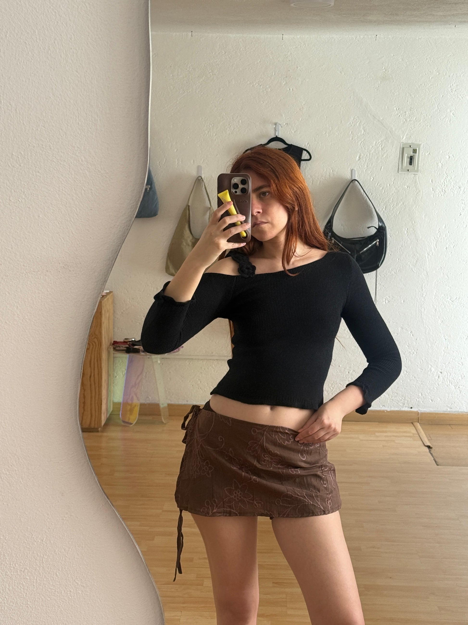 Este sueter está padrísimo porque abraza el cuerpo y queda un poquito como baby tee en versión sueter!! Aparte que el detalle de flores en el hombre esta mega cute !!!